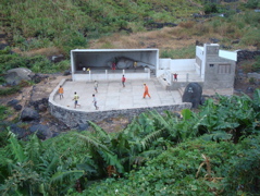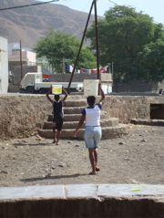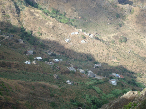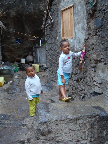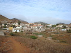 Nous ne sommes pas au bout des visites, Jean-Paul a encore un bijou caché au pied du Monte Gordo à nous dévoiler : Hortelao. Là encore, la route est sinueuse et non pavée et on comprend l'importance du 4X4. Là encore, nous sommes étonnés par la vie dans les rues, dans les cours. Les jeunes se retrouvent à la salle jouxtant l'épicerie. La playstation a débarqué au Cap Vert... les garçons sont subjugués. Les filles, elles, préfèrent danser dans l'autre partie de la pièce. Les vieux papotent entre eux, s'occupent de leurs bêtes ou tressent des nattes de roseaux pour isoler les toitures. Assise en face du village, j'écoute... cris de coqs, aboiements de chien, discussions, appels, quelques notes de musique traditionnelle par-ci, musique plus moderne venant de la salle des jeunes... et pas un bruit de moteur !