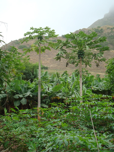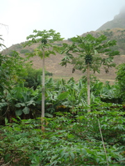 Le nord de l'île montre un visage très différent du sud : une fois passé le col, d'où la vue est impressionnante, le paysage verdit puis devient tropical au fond des vallées. Des systèmes d'irrigation astucieux permettent ces cultures : une galerie, qui va capter l'eau au fond d'une ancienne vallée fossile, puis un système de goutte à goutte pour l'amener auprès des plantes sans la gaspiller. Jean-Paul fait ses courses... des tomates chez une petite épicière, des papayes chez un producteur perdu au milieu de ses bananiers... Dans les jardins familiaux, les cultures ne sont pas délimitées et juxtaposées "propre en ordre" comme chez nous. Par endroit, le sol est couvert de feuillage et on reconnaît des courgettes, des courges, des pois qui partent à l'assaut des papayers dominant majestueusement le tout.