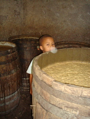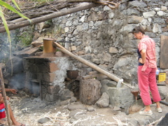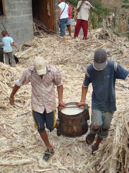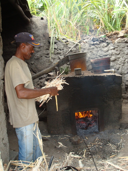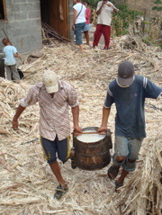 Mais Jean-Paul nous promet une visite plus étonnante encore et on en salive d'avance : le trapiche. Niché au fond d'une vallée, on le découvre enfin... une minuscule distillerie de grogue, le rhum local. Nous sommes bien loin des grandes distilleries antillaises ! La canne est broyée dans un petit moulin électrique (il n'y a pas longtemps, les boeufs et les mules le faisaient tourner). Le jus est filtré puis mis à fermenter dans des cuves. Il est ensuite versé dans l'alambic est posé au dessus d'un feu réglé constamment et alimenté de petits écheveaux de fibres de canne. La vapeur est refroidie par l'eau d'un réservoir situé en amont qui est repompée par la suite pour ne pas en perdre une goutte. Le grogue s'écoule alors directement dans une grosse bouteille. Nous visitons un second trapiche l'après-midi, aussi artisanal mais plus soigné (photos). Nous achetons un litre de grogue et découvrons le soir... un peu tard... que c'est le meilleur rhum, le plus parfumé, que nous ayons jamais bu !
