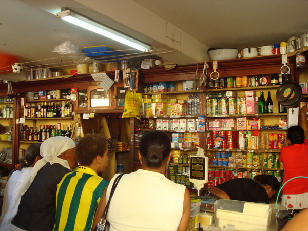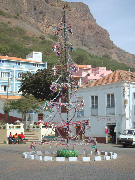 A midi, nous nous arrêtons à Vila de Ribeira, la capitale de l'île. La ville est animée, les gens venant de tous les villages en aluguer (taxi collectif) pour y faire leurs courses dans de jolies anciennes échopes. Un grand sapin de Noël trône sur la place centrale. Jean-Paul connaît bien entendu un petit restaurant sympa. On déguste notre première cachupa, plat traditionnel du Cap Vert. C'est une potée de haricots, pois, maïs qui peut être accompagnée de légumes et viande bouillis ou, comme aujourd'hui, de saucisse grillée.