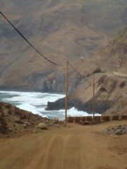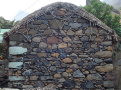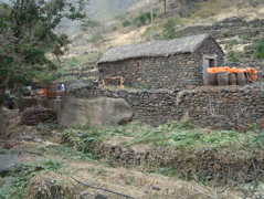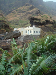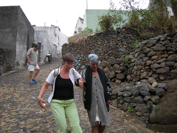 Nous arrivons à Ribeira de Prata et admirons sa jolie église. Il faut encore marcher un bon quart d'heure dans un chemin étroit. Nous voici enfin à Chun. Pas de route, pas d'eau courante...Et pourtant il y a du monde dans les maisons, des enfants dans les rues et sur la nouvelle place de jeux construite au seul endroit plat de la région. Les petites maisons traditionnelles aux toits végétaux nous émerveillent. Tout en haut du village, Jean-Paul retrouve avec émotion Paola, une vieille amie. Elle nous fait tout de suite entrer dans sa petite maison. Elle parle, parle et soudain pense que nous avons faim. Elle veut absolument nous faire une soupe. Impossible de la faire s'asseoir, elle se relève chaque fois pour partir à la cuisine. Nous n'avons malheureusement pas le temps de faire honneur à son accueil car la nuit tombe vite et le chemin est plein d'embûches. Paola nous accompagne jusqu'au bas du village. Je lui tiens le bras, mais je crois que c'est plutôt elle qui me soutient sur ces pavés glissants ! Elle se réjouit d'aller danser le soir et comme elle esquisse quelques pas, Pierre l'accompagne (voir le petit film Quicktime).