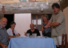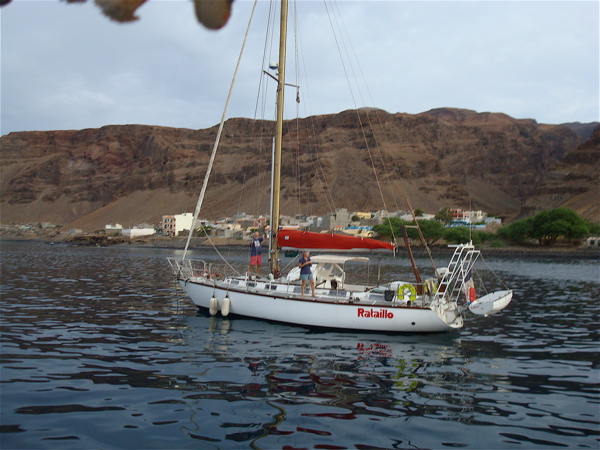 Nous ne sommes pas les seuls à profiter de notre guide enthousiaste. Nous avons entraîné dans l'aventure nos voisins de mouillage, Jean et Liliane sur Rataillo, qui sont de la région de Nantes comme Jean-Paul. Du coup nous festoyons d'un côté ou de l'autre en sortant les trésors de nos coffres, soutes et caves. Jean-Paul nous fait déguster son jambon sec maison (il tue le cochon avec des amis), puis du mérou noir, une pintade qu'il a fait chasser sur l'île, un fromage de chèvre de San Antao avec du pain maison puis de la papaye glacée. Quel luxe au cap Vert ! Nous profitons aussi de sa liaison ADSL pour envoyer nos voeux.