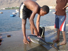 Un peu plus loin, sur le sable et au quai, les pêcheurs débarquent leurs poissons, de gros thons, thazards, coryphènes, ou des quantités de maquereaux et de garupa (nom local pour les mérous). Chouchou, notre gardien d'annexe, nous fait une démonstration du découpage d'un thon. Nous lui en achetons 2 kg... à 3 euros le kg ! ici, le thon est au prix du kilo de tomates ! Eux salent les poissons pour les conserver et les sèchent ensuite au soleil.
