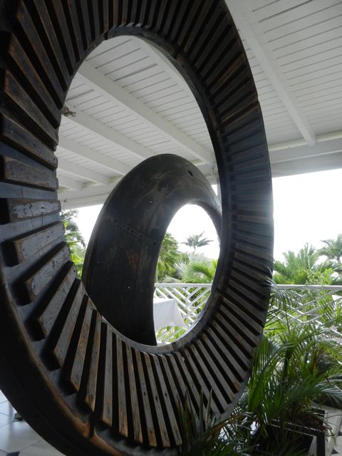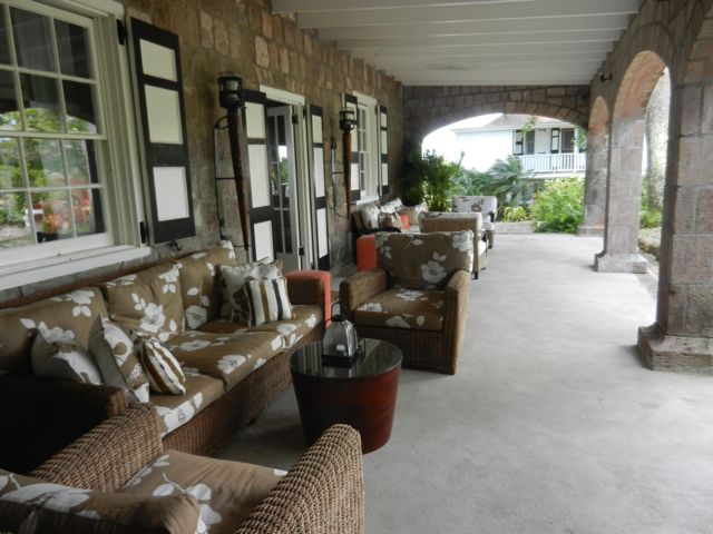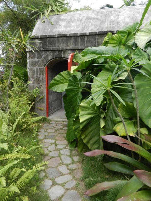 Nevis portait le surnom de reine des Antilles car elle était très productive et donc riche. Les plantations de sucre ont succédé à celles d'indigo, de tabac, de coton des premiers temps. A l'époque de l'esclavage, les bateaux négriers débarquaient leur triste cargaison sur l'île et on peut encore voir quelques cailloux de l'ancien marché aux esclaves où les îles voisines venaient s'approvisionner. Les plantations ont disparu mais certaines maisons de maîtres ont été très bien restaurées et transformées en hôtels luxueux. Grâce à notre taxi, nous avons pu en visiter trois, chacune dans un style différent.