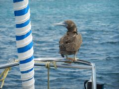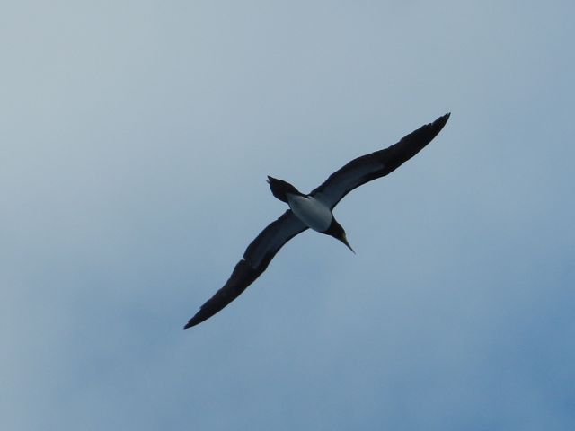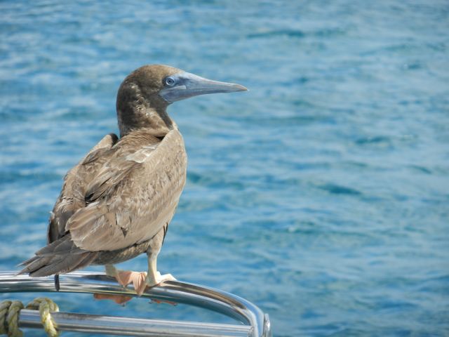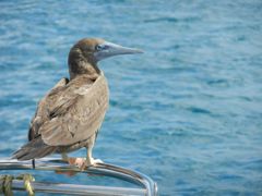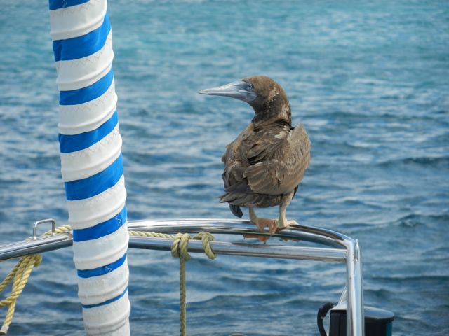 Et pour finir... une histoire de fous ! A Nevis, nous avons la visite d'un jeune fou. Comme je peux m'en approcher à 50 cm et presque le toucher, j'en déduis qu'il est très fatigué et le laisse tranquille après m'être assurée qu'il est au-dessus de l'eau et ne va pas salir notre pont si jamais... Un peu plus tard, en lui faisant une petite visite, on remarque qu'avec le vent, le pont est tout de même bien crêpi... alors on le fait gentiment s'envoler ! Les fous sont, avec les pélicans et les frégates, les oiseaux qu'on rencontre le plus souvent. Ils volent au ras des vagues pour pêcher, leurs ailes frôlant l'eau. En navigation, au large de St-Kitts, un adulte vient se positionner à notre vent, à mi-hauteur du mât, en vol stationnaire, pour observer les poissons volants dérangés par notre passage et leur fondre dessus. Il fait ensuite un tour du bateau, rase l'étai et revient se placer. On craint à nouveau qu'il se lâche car on n'aurait pas le temps de sortir le parapluie ! Et les vieux fous ? Ils se paient 140 nm de navigation et une nuit dans 25 à 30 nds établis et une belle vague de travers jusqu'aux Vierges Américaines ! Histoire de se prouver qu'ils restent jeunes !