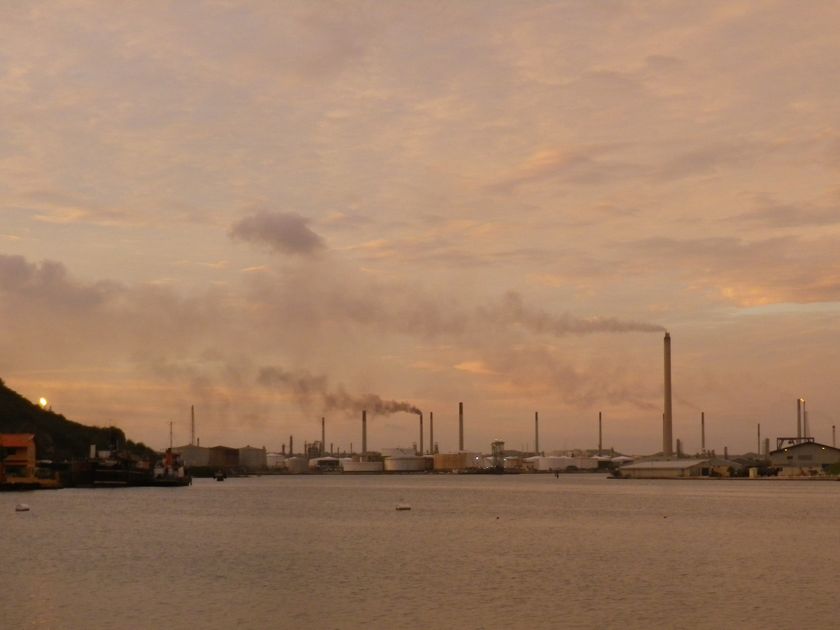Après quatre nuits d'hôtel, il est temps de regagner le bord. Anegada a été mis à l'eau et nous pouvons admirer le paysage des raffineries au coucher du soleil depuis la petite marina du chantier. Pas encore le paradis !