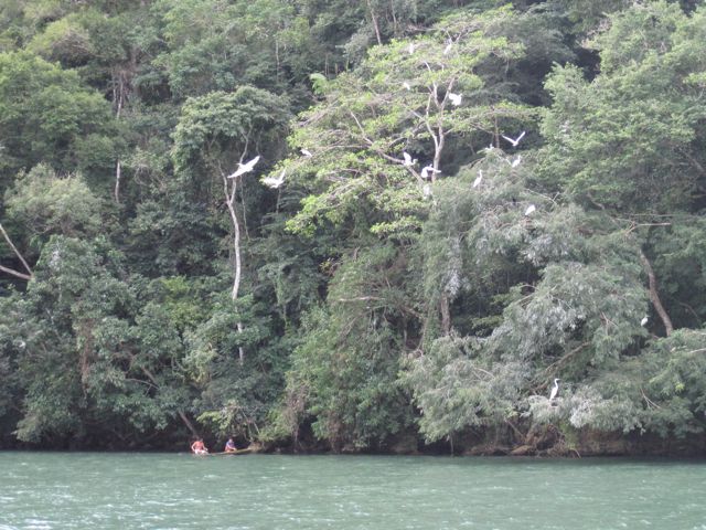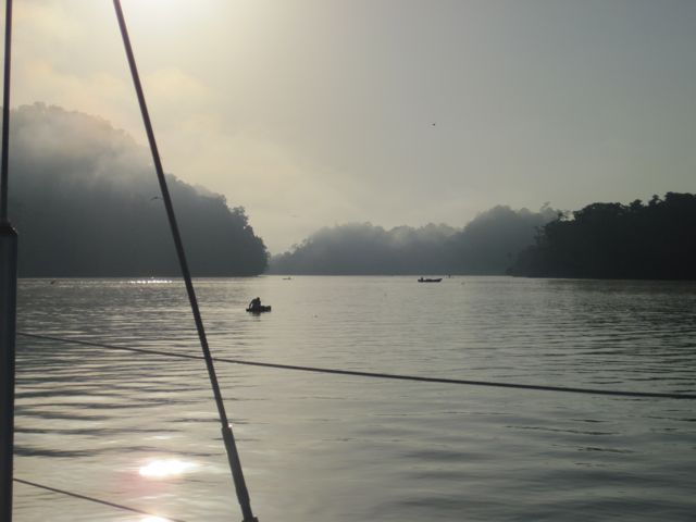 Dernier jour dans le Rio... nous explorons en annexe toutes les baies de la zone de Cayo Quemado. Derrière les arbres, on devine les habitations des indiens au linge qui sèche. Un homme pêche à l'épervier. J'essaie de le photographier et nous restons près de lui. A chaque remontée du filet, vide, il se retourne vers nous et rigole... philosophe. Des îlots abritent des colonies de cormorans et d'aigrettes... bruit et odeur impressionnants ! Le lendemain, quand nous quittons le mouillage, c'est l'heure des enfants, sac au dos, qui se rendent à l'école en "kayuco". La brume se lève doucement sur la rivière qui "fume" et le spectacle est tout simplement magique. Nous ne regrettons pas nos deux semaines au Guatemala, deux semaines marquées par la verdure mais aussi la gentillesse et les sourires des habitants de ce beau pays. Nous leur souhaitons l'avenir de paix et de prospérité qu'ils méritent.