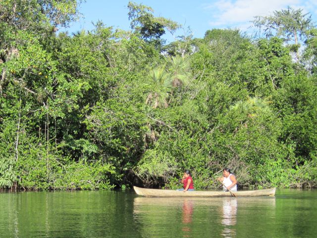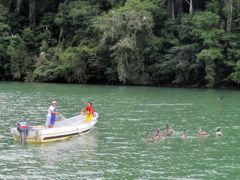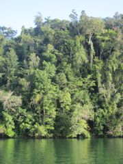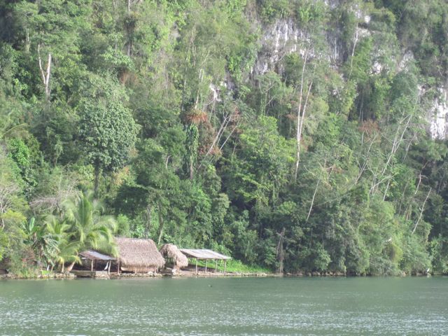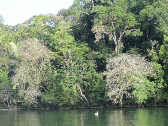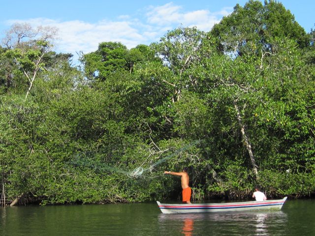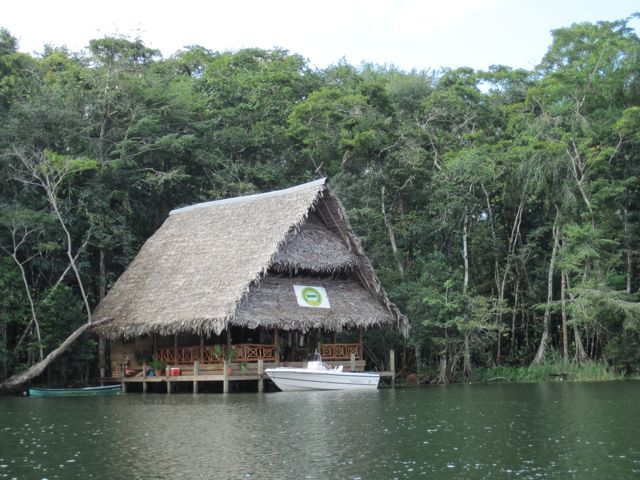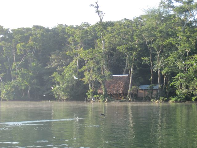 Mais revenons à notre entrée... Après ces émotions, la magnifique remontée du Rio au coucher du soleil nous récompense. Le spectacle est magique. La jungle descend jusqu'à la rivière et il y a des oiseaux partout. Les pélicans plongent devant nous ou attendent le poisson à côté des barques de pêche, les cormorans ont toujours l'air de couler avec juste leur tête qui dépasse de l'eau, les aigrettes se perchent sur les arbres et font des taches blanches dans la verdure. Des lanchas rapides nous dépassent. Sur les bords de la rivière, sous les branches tombantes, les indiens se faufilent en pêchant depuis leur pirogue. D'autres lancent avec habilité leur épervier. Les maisons ont de magnifiques toits de palme. Nous n'allons que jusqu'à l'entrée de Golfete, à Texan Bay, car la nuit va tomber. Une fois que les derniers clients ont quitté le bar de la petite "marina" (heureusement les soirées sont rarement très longues aux Caraïbes), nous n'entendons plus que les bruits de la jungle, les oiseaux et de drôles de coups saccadés que nous n'arrivons pas à identifier. Pics ? Grenouilles ?