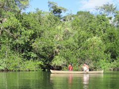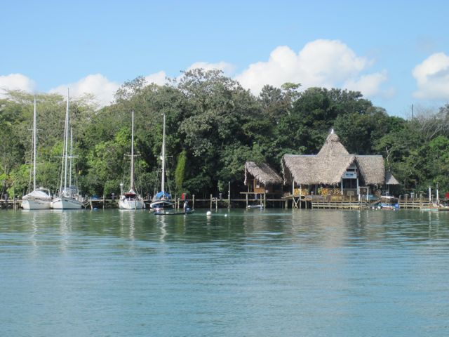 La remontée de Golfete, un petit lac dû à l'élargissement de la rivière, se fait tranquillement au moteur. Le fond est de 4 m tout du long. Bien assez pour nous épargner de nouvelles frayeurs ! Après deux heures de route, nous approchons de la zone des marinas. Si les premiers navigateurs ayant remonté le Rio ont été de vrais explorateurs, nous sommes maintenant juste des plaisanciers parmi des centaines d'autres profitant de ces eaux douces, calmes et bien protégées. Des pontons de bois offrant leurs amarres à quelques bateaux se nichent dans tous les recoins. Nous sommes à la pleine saison de navigation et pourtant nombreux sont encore les voiliers à quai. La sécurité du plan d'eau, la gentillesse des habitants, la beauté du paysage ont retenu prisonniers volontaires nombre de navigateurs. On a même vu des quilles tronquées de 10 à 20 cm pour passer la barre plus facilement, au détriment des qualités marines du bateau qui ne seront de toute manière plus utilisées. Cela devient une caravane flottante. D'autres personnes quittent leur bateau ou le vendent et achètent du terrain pour se construire une jolie maison au toit de palme. On peut les comprendre !