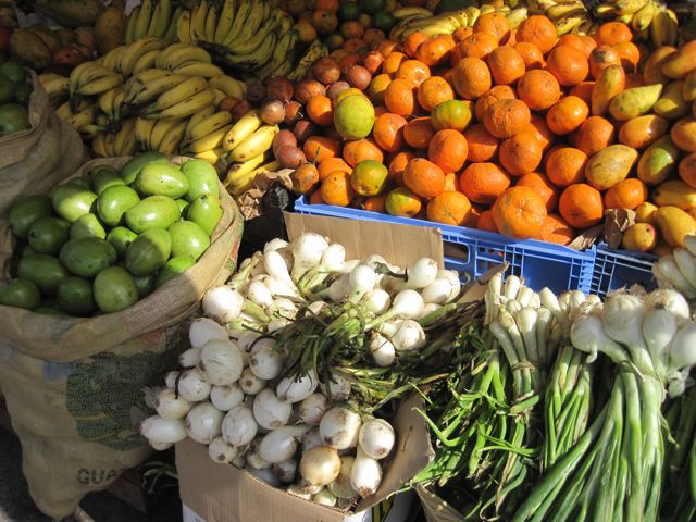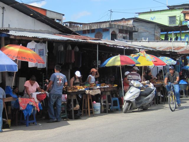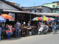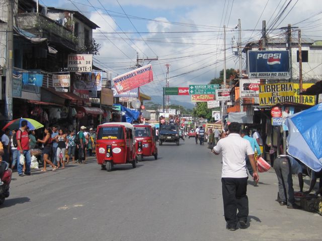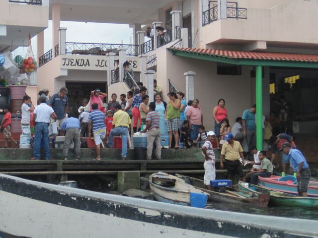 Quelques marinas de plus grande envergure et deux chantiers occupent les rives proches du grand pont enjambant le Rio. Ce pont relie le sud au nord du pays et le traffic y est intense. Une bourgade s'est développée le long de cet axe important et nous découvrons avec ravissement les petites échoppes, les stands de fruits et légumes magnifiques et la vie grouillante de Rio Dulce, alias Fronteras. Pas de trottoir, les stands de fritures diverses sont à même la route et les énormes camions transportant du bois, des vaches ou des citernes marquées "inflammable" les frôlent à quelques centimètres.