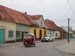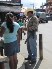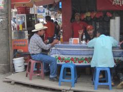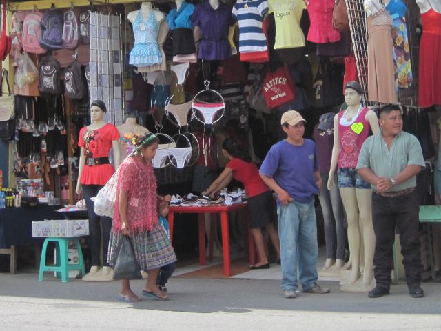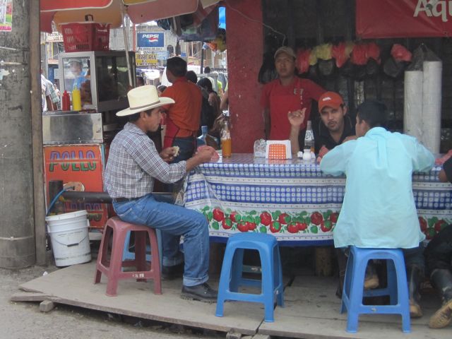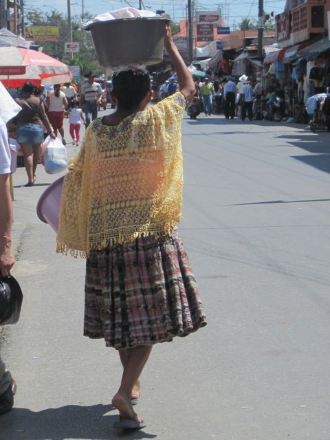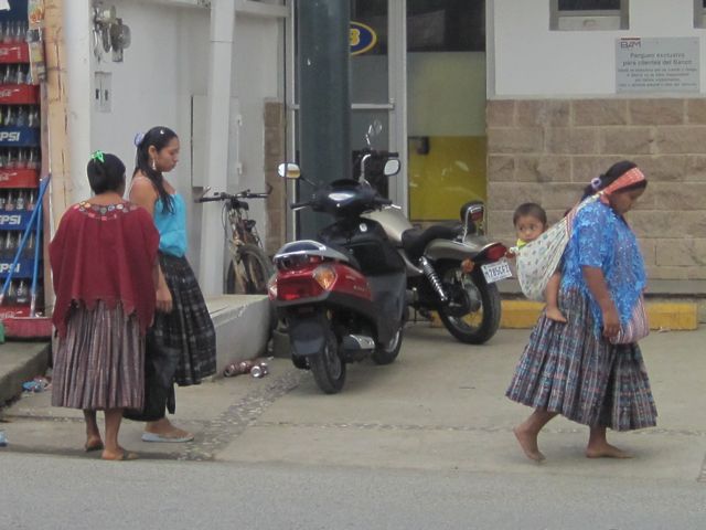 Nous nous asseyons pour manger une tortilla et regardons par la fenêtre comme si c'était une télévision. Les hommes portent souvent un grand chapeau blanc, une chemise de toile et un ceinturon... comme des cow-boys. Il y a du reste un magasin qui vend des selles. Les femmes de la communauté quechi, une des communautés mayas, ont de grandes jupes plissées, tissées de fils très colorés et une blouse en dentelle. Elles portent les bébés sur le dos grâce à une sangle sur leur front. Les taxis sont de jolis touc-touc rouges.