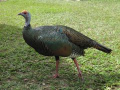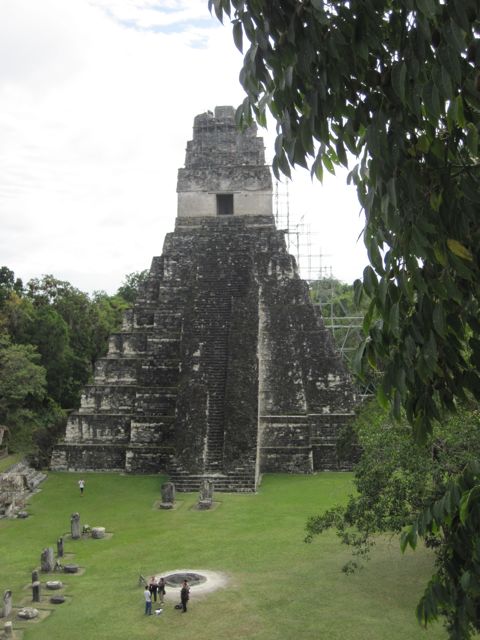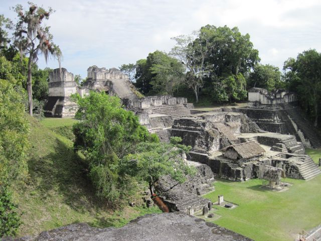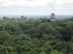 C'est de Flores que s'organisent les visites de Tikal. Nous rencontrons beaucoup de jeunes voyageant sac au dos... d'autant que nous avons choisi l'économie pour notre hôtel ! Départ à 4h30 du matin pour les courageux qui veulent voir le lever du soleil depuis le templs IV. Pas nous... la météo annonce couvert ! Nous partons à 7h pour 1h30 de bus, encore, avant d'entrer dans ce parc de 576 km2 envahi par le jungle. A l'époque, entre environ 800 ans avant J-C et 800 ans après J-C, toute la zone était cultivée et habitée. On ne sait pas pourquoi les Mayas ont disparu et leurs sites ont été oubliés et envahis par la forêt. Ce n'est qu'en 1848 que Tikal a été découvert et actuellement encore de nombreux temples sont sous la végétation. Mais cette ballade dans la jungle, de temple en temple, a bien du charme. Les singes-araignées jouent au-dessus de nos têtes, des sortes de paons picorent sur les places et les touristes ne sont pas encore arrivés. On visite donc la place principale dans des conditions idéales. A mon étonnement, Pierre insiste pour monter sur le temple IV, d'où la vue sur la forêt et les autres monuments qui dépassent est superbe. Je me demande comment il va redescendre toutes ces marches ! Heureusement il y a une barrière solide et il s'appuie sur les bras pour soulager ses genoux.