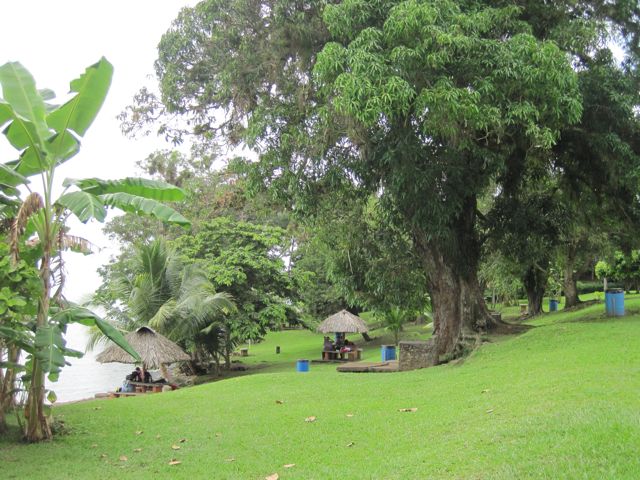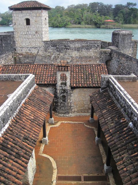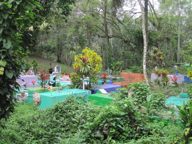 De retour au bateau, je visite seule (Pierre doit se remettre de ses excès) le château de San Felipe qui garde l'entrée du lac Izabal. Au XVIème siècle, les espagnols avaient des entrepots au sud du lac, qui regorgeaient de marchandises convoitées par les pirates de la région. Un protection devint vite nécessaire et le château s'agrandit au fil des ans, des attaques, des destructions et reconstructions. Je suis impressionnée par la qualité de l'accueil, l'entretien du parc et le billet d'entrée qui tient lieu de feuillet explicatif. Le long de l'allée joliment arborisée, un petit groupe de tombes qui semble montrer qu'au Guatemala, plus qu'ailleurs, la mort fait partie du quotidien... (Il n'y a qu'à lire les journaux pour s'en convaincre: les nouvelles ne parlent que de meurtres, assassinats et autres horreurs !) Comme nous l'avions déjà remarqué depuis le bus, les cimetières ne sont pas fermés, clôturés, ils sont en pleine nature et les tombes sont aussi colorées que les maisons.