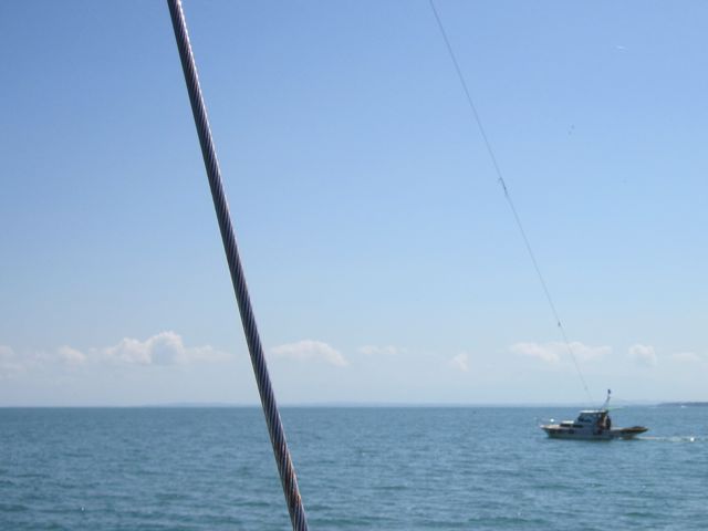 50 m après la bouée, nous sommes plantés ! Moteur à fond (certains passent en force qu'on nous a dit !), cela ne bouge pas d'un pouce ! Plan D à exécution, l'annexe est hissée et pour donner plus de gîte, je vais aussi en bout de bôme suspendue à la drisse de spi. Le bateau prend 10 ° mais ne bouge toujours pas. Heureusement, la lancha est restée à proximité, sentant le bon coup. Nous lui donnons une drisse de tête de mât rallongée d'un long cordage. Et le ballet commence : la lancha tire sur notre mât perpendiculairement à la route pour nous donner un maximum de gîte. Moteur à fond, nous avançons de quelques mètres puis prenons de la vitesse. L'annexe, toujours suspendue, se met en travers en touchant l'eau et se renverse. Tout part à l'eau. La lancha vient à notre secours et ramasse les jerrycans. Puis on recommence, avec l'annexe en remorque cette fois-ci. Mais à chaque fois que la tension se relâche, nous touchons à nouveau. Pierre ne peut pas diriger le bateau et petit à petit nous sortons du chenal. Il faut encore plus de gîte. Pour nous recentrer, nous essayons dans l'autre sens. Après une heure trente d'efforts et quelques gallons d'essence, nous arrivons enfin devant le quai de Livingston. Même là, nous touchons et nous demandons à nos sauveteurs de nous amener plus loin, dans des eaux plus profondes. Ouf ! Cela nous aura coûté 100 dollars et un bon sablage du bas de la quille ! Du coup, on attendra des marées plus importantes pour sortir !