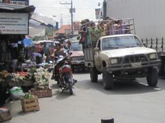 Quand c'est jour de grand marché (trois jours tous les deux mois), les habitants des campagnes viennent à la ville entassés, debout à l'arrière d'un pick-up. Dans un parc à l'entrée bien gardée où il faut montrer patte blanche, de longues queues se forment. Nous nous renseignons, toujours curieux. Il s'agit de la distribution des allocations familiales ! Cela vaut donc bien la peine de voyager debout pour venir à la ville !
