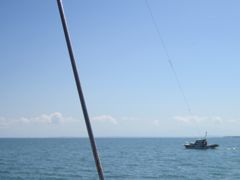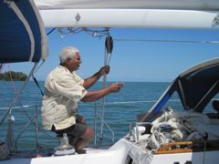 Mardi 8 février, nous sommes à l'ancre à la bouée d'entrée du "chenal", invisible dans cette eau verte. Nous avons les waypoints de Jean-Luc inscrits sur le traceur de carte. Nous préparons un système pour donner de la gite au bateau si jamais : l'annexe suspendue en bout de bôme et chargée de 3 bidons de 20 l de fuel. Une lancha vient nous demander si nous avons besoin d'aide. "non, non, nous avons tout prévu, nous allons nous débrouiller tout seuls, comme des grands !"