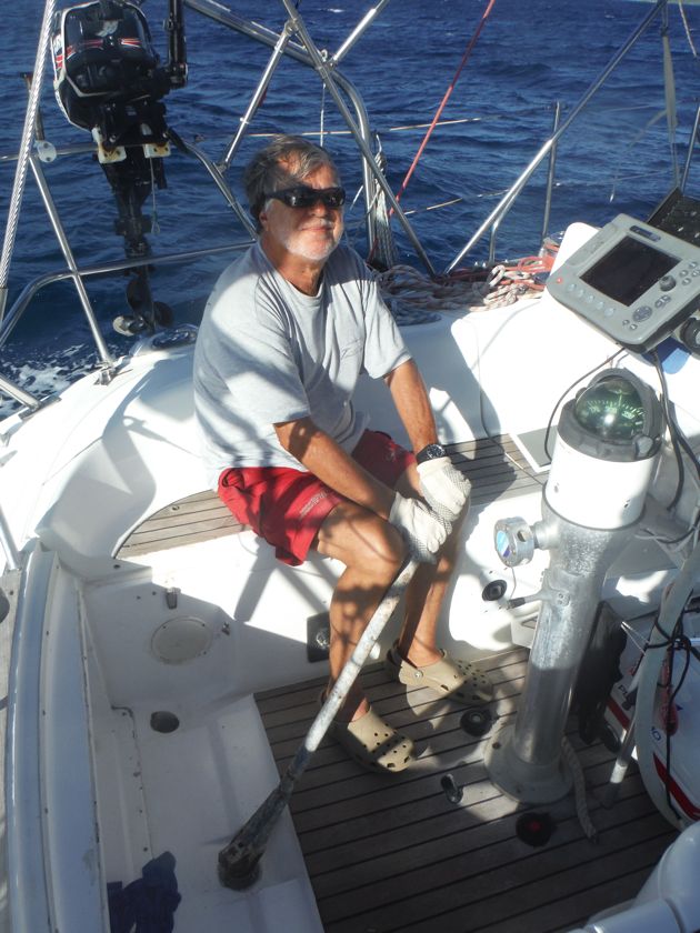Le bateau va dans tous les sens. Nous commençons par affaler la grand-voile tant bien que mal. Anegada vire de bord et la trinquette se met à contre. Dans cette position, à la cape, il se stabilise et dérive doucement... malheureusement en direction du sud... d'où l'on vient ! On constate au moins qu'il tient la cape et on en profite pour reprendre nos esprits. Ensuite Pierre enclanche le moteur et met la marche avant. Anegada vire immédiatement. Nous en déduisons que le safran est en travers et, comme nous avons très peu d'amplitude dans la barre à roue, qu'il est bloqué dans cette position.