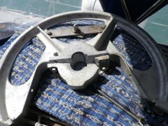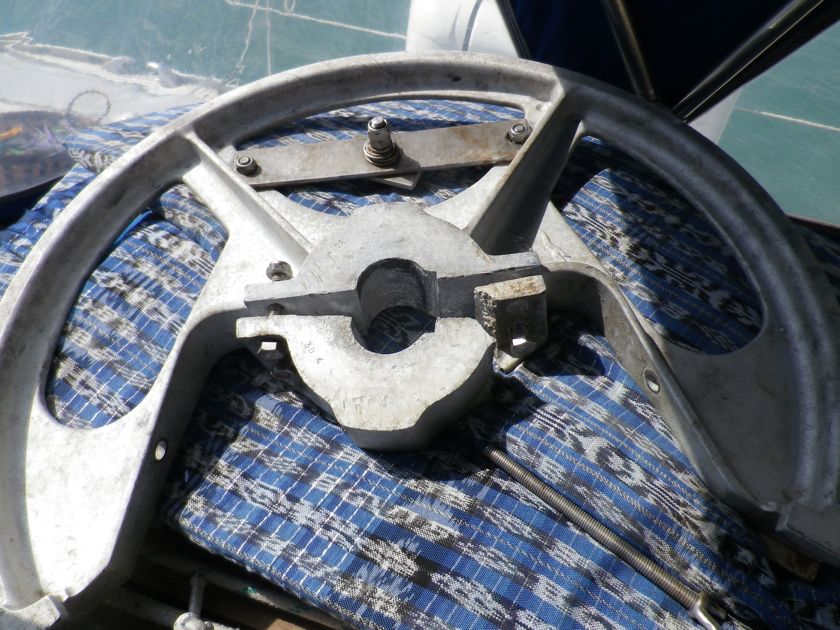 En milieu d'après-midi, nous nous décidons à ouvrir le compartiment donnant accès au système de barre. Surprise ! C'est le palier de barre qui a cassé (grosse roue en fonte d'aluminum qui transmet la direction entre la barre à roue et le safran grâce à deux câbles, les drosses). Du coup on remarque que le safran a l'air de tourner normalement sur son axe. Je dégage le pilote et le testeur d'angle de barre pour qu'ils ne s'abîment pas inutilement.