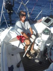 Au coucher du soleil, nous perdons courage et décisons de tout lâcher. Nous avertissons Canopus que nous nous débrouillons par nos propres moyens pendant la nuit et que nous apprécions s'ils restent à proximité. Nous leur demandons une météo mais ils ne l'ont pas. Nous essayons alors la barre franche de secours qui avait été inutilisable au Cap Vert. Comme nous n'avons plus de secteur ni de drosses, elle est beaucoup plus facile à manoeuvrer, même si, avec les vagues, c'est parfois hyper dur de la tenir. Les marins doivent être très étonnés de nous voir partir tout seuls à 5 nds avec un bout de trinquette et se demander si nous nous sommes moqués d'eux ! D'autant qu'eux sont toujours bloqués par la corde dans l'hélice. Nous essayons de leur expliquer qu'on arrive à barrer mais que c'est très dur. Ils arrivent finalement à se déagager et à nous suivre.
