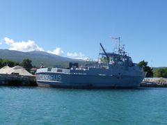 Sur ce... à 16h30, le bateau arrive enfin ! Le Canopus 107 appelle à la VHF et nous pose encore de nombreuses questions... l'âge du capitaine... adresse, no de passeport pour contacter notre ambassade (???). Toujours très poliment et dans un anglais approximatif. Nous passons 5 minutes à essayer de donner la lettre X, avec tous les accents possible. Même Xray du code international n'est pas compris !
