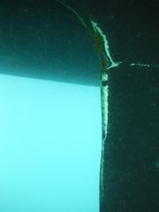 Après un jour de repos, nous déposons le balcon avant et Pierre l'emmène en motoconcho chez un soudeur, à même le trottoir. Travail de cochon mais cela tiendra jusqu'à ce qu'on trouve un vrai soudeur. On ne veut pas abuser de John ! Nous sortons aussi le palier pour le nettoyer et le préparer pour la réparation. Je vais faire quelques photos sous l'eau. Le haut du lest est un peu marqué à l'arrière, comme le bord de fuite du safran. Mais l'hélice est intacte.
