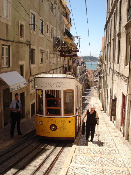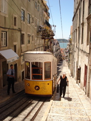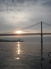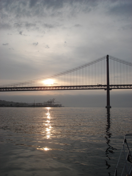 Heureusement, le dernier après-midi est plus agréable. Nous avançons tranquillement sous génois seul car nous visons une arrivée au petit matin, ne connaissant pas assez Lisbonne pour une arrivée de nuit. Le GPS nous indique la vitesse à tenir, pas la peine de se presser. Parties de Yatsy au soleil, apéritif sur la terrasse. La nuit est plus tendue au milieu des pêcheurs et des cargos. L'arrivée à Lisbonne au petit matin a été la récompense de cette traversée. Les nuages colorés en orange par les lumières de la ville, l'odeur des pins venant de la côte sud du Tage, le passage de l'entrée du Tage en même temps que les monstres chargés de container aperçus en zone d'attente à 30 nm au large, la tour de Belem et le pont... le fameux pont du 25 avril. Nicolas le mitraille. Grâce à Sofia, lisboète d'origine, nous découvrons quelques aspects de cette ville : les funiculaires, les rues piétonnes, les pasteis de nata de Belem et, le soir, le fado et l'ambiance extraordinaire des rues du Barrio Alto. |