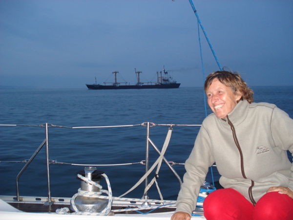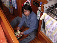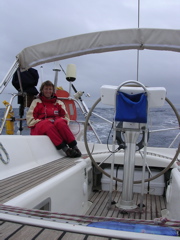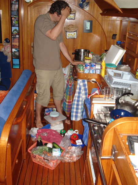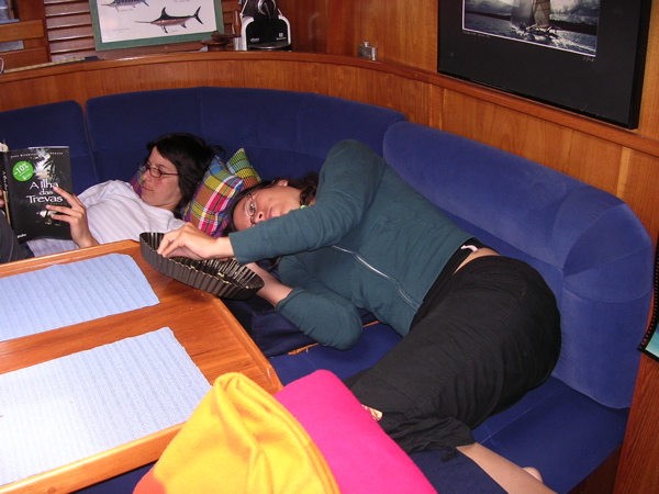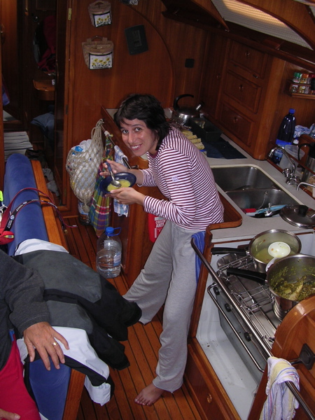 | Malgré cela, l'équipage a gardé le moral et l'ambiance était au beau fixe grâce aux prouesses culinaires de chacun. La lecture a fait passer le temps, sauf pour Elo qui, avec son mal de mer tenace, ne peut pas lire. Heureusement qu'il y a l'iPod ! Pierre ayant quitté le bord pour une petite semaine en Suisse, nous n'étions heureusement que quatre et nous disposions de couchettes relativement confortables pour chacun. A deux par cabine dans ces conditions, nous aurions souffert bien plus. |