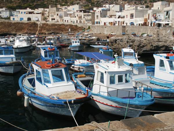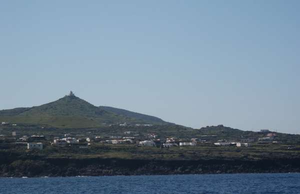 Depuis Monastir, nous avons aussi découvert la Sicile et son avant-poste, Pantelleria. C'est une île volcanique plantée au milieu du canal de Sicile. C'est devenu, paraît-il, le terrain de jeu des riches italiens qui font transformer les anciens "dammusi", maisons traditionnelles en pierre de lave et toit concave peint à la chaux. Comme l'île est abrupte et très ventée, elle garde tout de même un aspect sauvage. Le contraste entre le vert de la végétation, le noir de la lave et des dammusi, le blanc des toits et le bleu de la mer en fait un paysage dont on ne se lasse pas. Mieux vaut ne pas y arriver de nuit car l'entrée du port est très mal balisée. Lors de notre dernier passage, voici le spectacle que nous avons eu en nous réveillant le matin (non, ce n'est pas nous, nous avons passé quelques heures auparavant... de jour !) |
