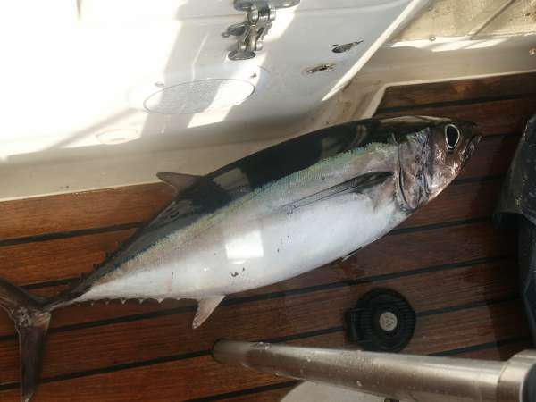 Cet été, nous testons le matériel dans une croisière méditerranéenne. Nous avons acheté le Sun Kiss en novembre et nous ne le connaissons pas encore bien, malgré les heures de bricolage de l'hiver et du printemps. Traversée convaincante de Port-Camargue à Minorque dans une tramontane de force 4 à 6 pendant 24 heures : les enrouleurs de génois et trinquette fonctionnent à merveille. Les 12 heures suivantes se font au moteur par calme plat mais permettent de pêcher 3 thons ! Les cannes et rapalas sont bien affutés ! Nous nous régalons, distribuons une partie à Sir Esnest (Thibault et Joya) rencontrés à Fornells et mettons le reste en conserve dans de l'huile d'olive. |