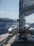 La suite est moins glorieuse mais cette croisière est destinée à cela : tester tout le matériel du bord et changer ce qui n'est pas fiable..Panne de moteur alors que nous sommes au fond d'une cala bien étroite. Heureusement, la météo est avec nous et le vent est calme. Nous plongons dans les manuels d'entretien de moteurs diesel et tentons tout ce qui est possible. Puis nous essayons d'appeler tous les mécaniciens de l'île mais tous sont débordés. La génératrice rend l'âme à son tour. Nous nous décidons à rejoindre Mahon à la voile. C'est une navigation très lémanique, dans de petits airs et au près. A la fin de la journée, nous accostons à l'aide de l'annexe qui pousse puis tire le bateau. Un petit resto nous remet les idées en place et la nuit porte conseil car le lendemain, une heure avant l'arrivée prévue d'un mécanicien, Pierre décide d'examiner la vanne de sortie du réservoir : rien ne sort ! La sortie est bloquée par une masse visqueuse que nous aspirons. Victoire ! Nous pouvons décommander le mécanicien, tout fonctionne à nouveau. C'est tout de même rassurant de voir que l'on peut se débrouiller par soi-même. Traversée magnifique sous spi sur Majorque, puis découverte de la côte Nord : Pollensa et sa grande baie et surtout Soller. Nous prenons le vieux tram pour aller à la ville et redevenir piétons pour quelques heures. Vent fort et grosses vagues pour cette navigation. |